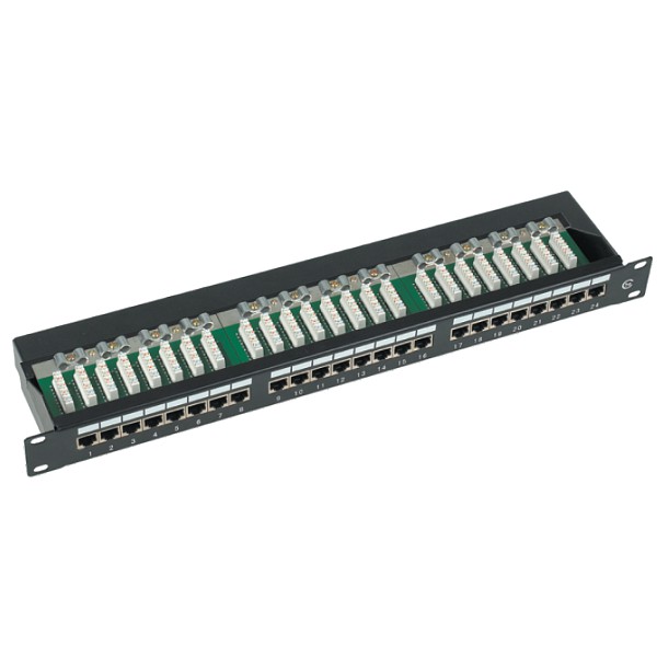 Patch panel (panel krosowy) jest pasywnym elementem okablowania strukturalnego stosowanym do zakańczania i organizowania kabli typu skrętka w szafach rack 19". Wyposażony jest w 24 ekranowane gniazda RJ45 kategorii 6.