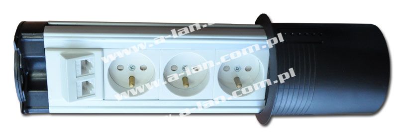 Rozwiązanie pozwalające w bardzo estetyczny sposób doprowadzić zasilanie 230V oraz sieć komputerową i telefoniczną do mebli biurowych, hotelowych, konferencyjnych itp. Kolumna przystosowana jest do wbudowania w blat meblowy. Została wyposażona w bardzo wygodny system "PUSH & PULL", który pozwala wysunąć kolumnę aby odłączyć urządzenie lub po skończonej pracy schować kolumnę w blacie. Posiada wbudowane 3 gniazda zasilające 230V oraz dwa gniazda komputerowe RJ45.